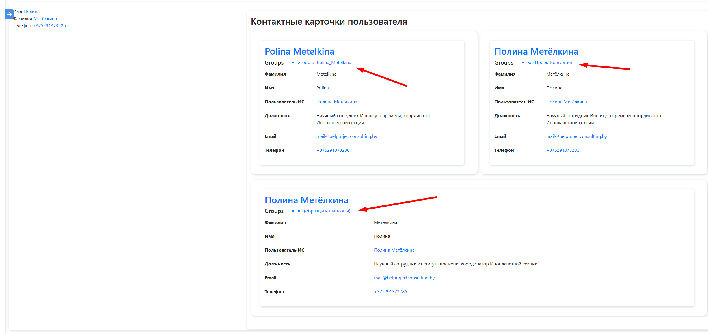 При присоединении к группе для пользователя автоматически создается карточка контакта, редактирование информации в которой доступно самому пользователю или администраторам группы: